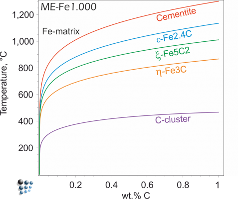 Figure 1. Calculated thermodynamic solvi of metastable Carbon-cluster and transition carbides in the Fe-C system.