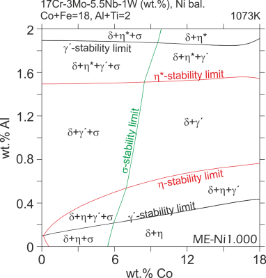 Figure 1. Calculated thermodynamic stabilities of intermetallic precipitate phases in 718-type Ni-base superalloy with varying Co- and Al-alloying. Two different Eta-phases, either Ti- (η) or Al- and Nb-rich (η*), occur at different nominal Al/Ti ratios.